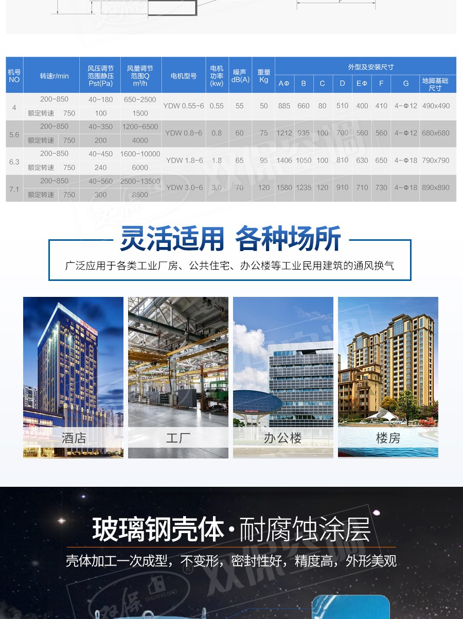 【風(fēng)機(jī)特點(diǎn)】運(yùn)行噪音低、流量大、耐腐蝕、效率高、重量輕、安裝方便等特點(diǎn)。